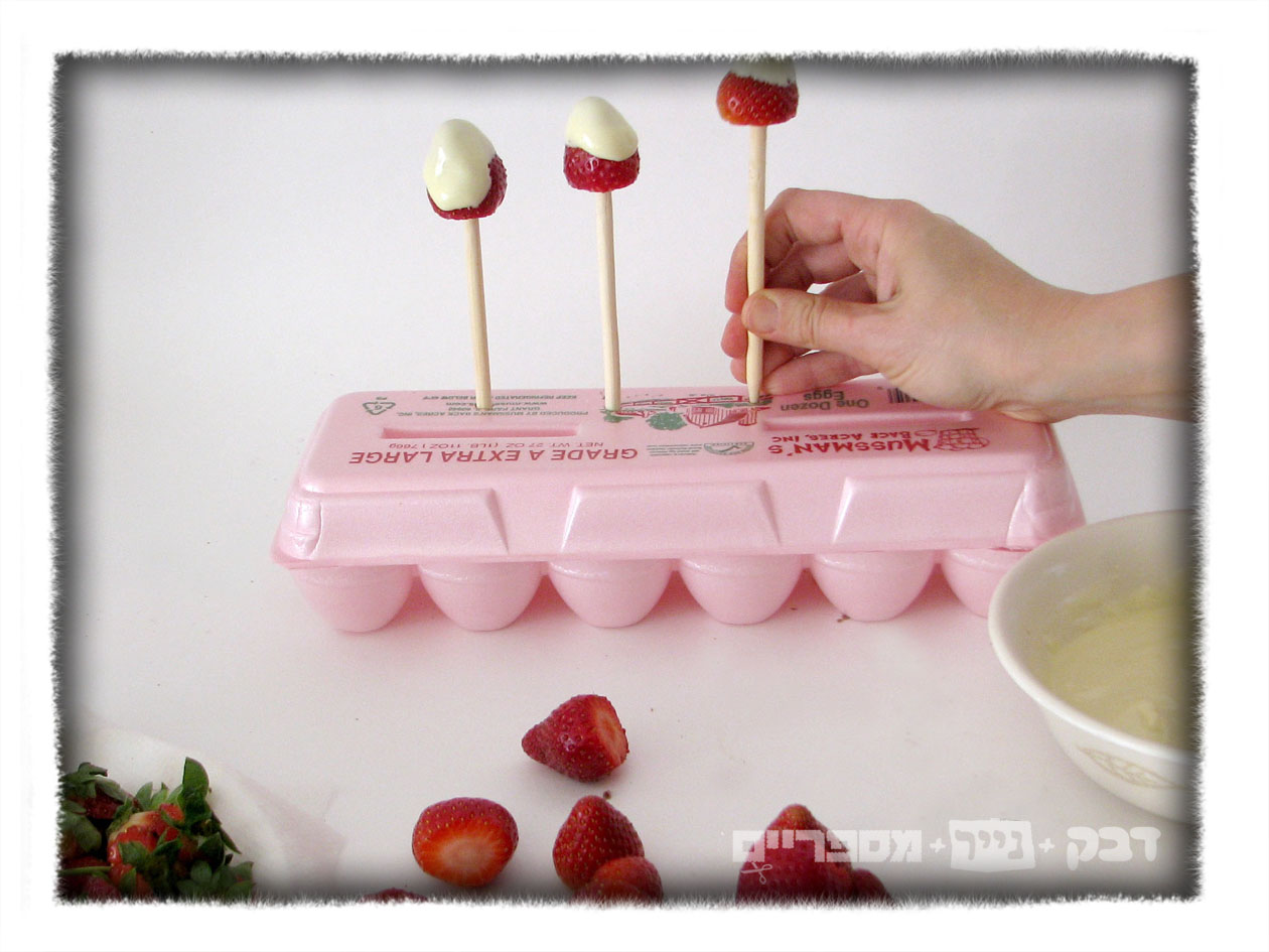 For the edible candles, I dipped small washed strawberries in melted white chocolate (with a tiny drop of oil). I had found skewers in the baking aisle at Michael’s once and had no idea what to do with them – until now. I found that a Styrofoam egg carton (empty!) is a good vehicle for standing the candles upright until the chocolate hardens.