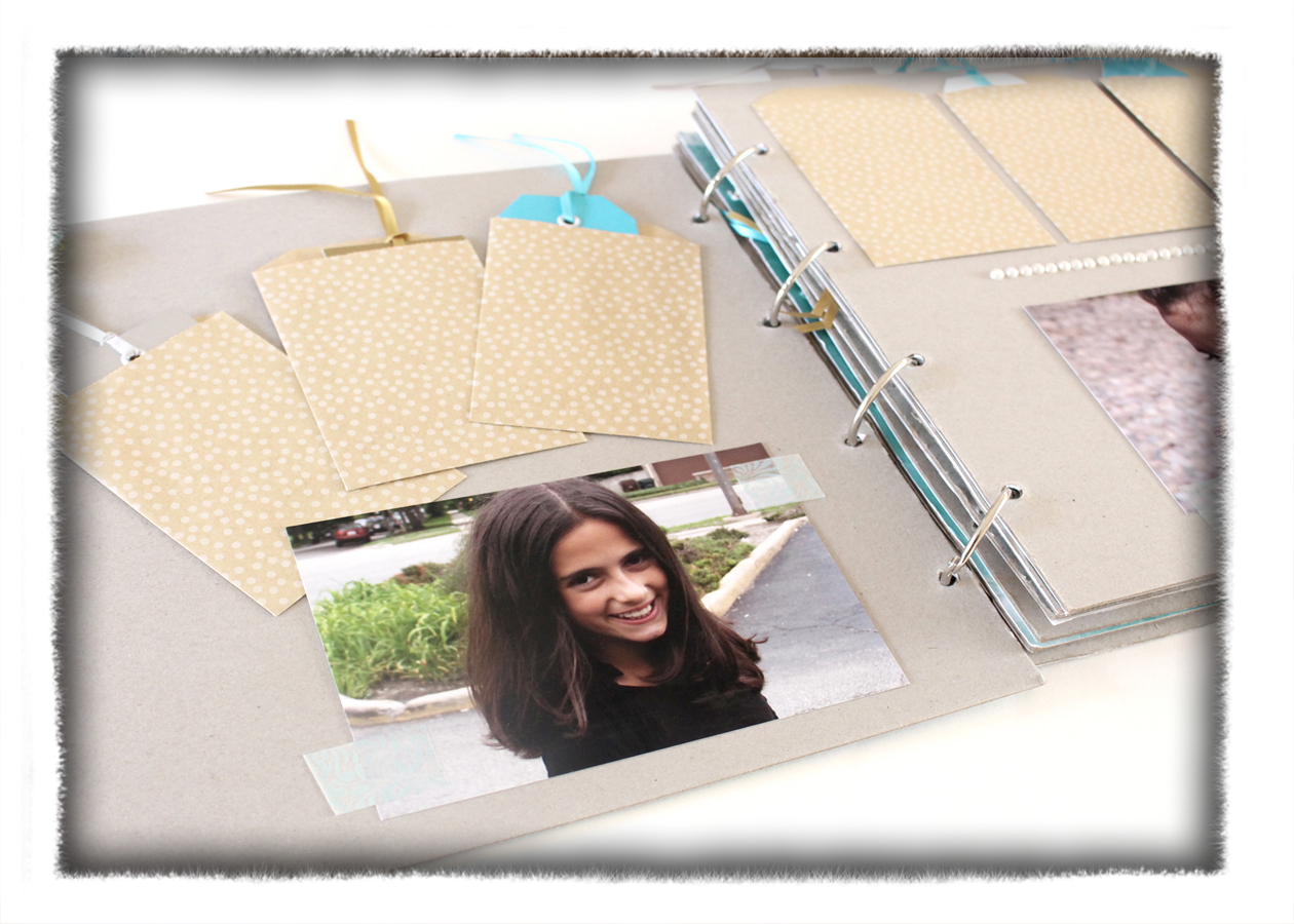Since the paper itself was pretty brown and drab, I added pieces of 12″ x 12″ patterned paper, pictures of Attar, and paper flowers embellishments in gold, turquoise, and silver.