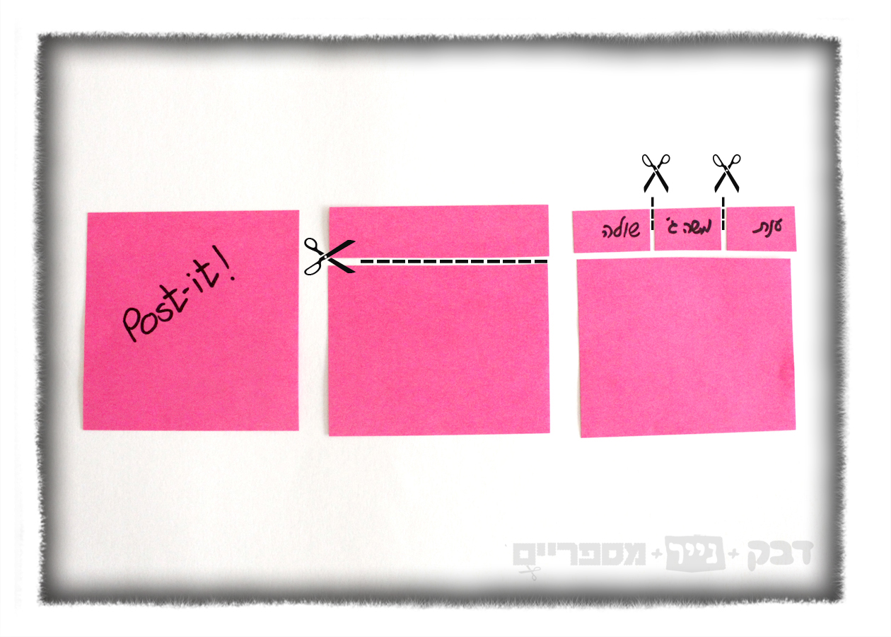 The stickers can be made by cutting out the sticky strip of a Post-It notes, or if you find it, Post-it Full Adhesive Roll – a paper roll with a sticky back that can be cut into which ever length you choose, and you can easily remove and re-position.